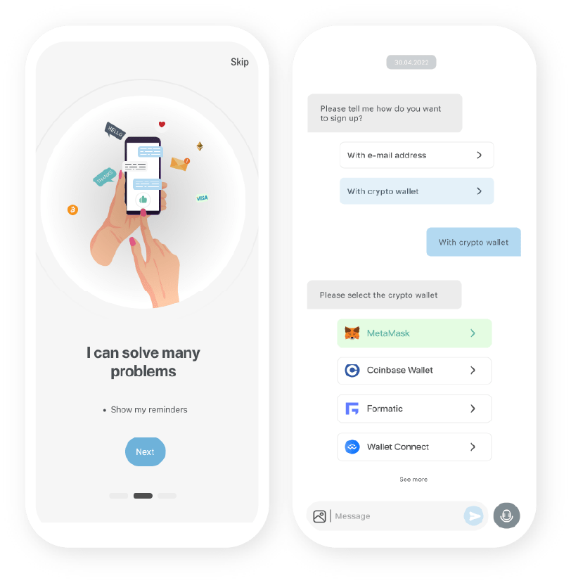 Design for the Elly Chatbot is complete. This month, our aim was to enable the users register and log-in via crypto wallets. Users will be able to check their crypto wallet balances as well as organize their payments via short orders.